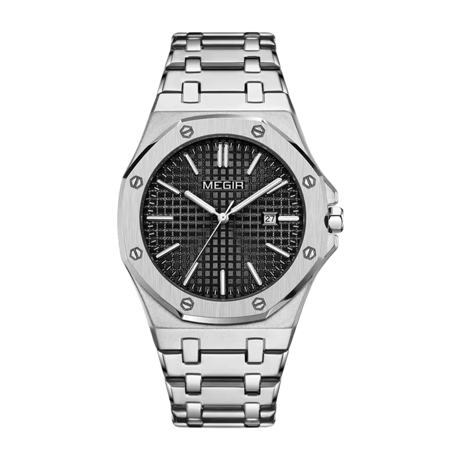 El Vortex es la definición de elegancia limpia. Su diseño completamente plateado o con esfera negra, con patrón texturizado en la esfera aporta un aire moderno y distinguido. Perfecto para quienes aprecian la sobriedad y la perfección geométrica en su muñeca.